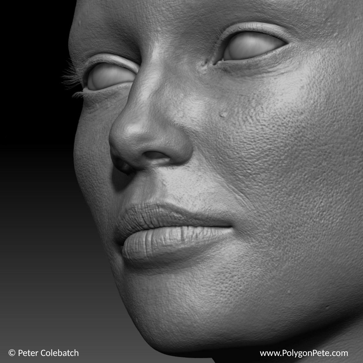 This was a study of human skin and anatomical form, the purpose being to create a believable 3d digital double. The textures are all 8k and suitable for close ups as seen below. I created the model with Maya, combined photos with hand painting for the skin maps in Photoshop and generated the shaders with the Mental Ray SSS shaders. I created the bump and displacement maps with Mudbox.